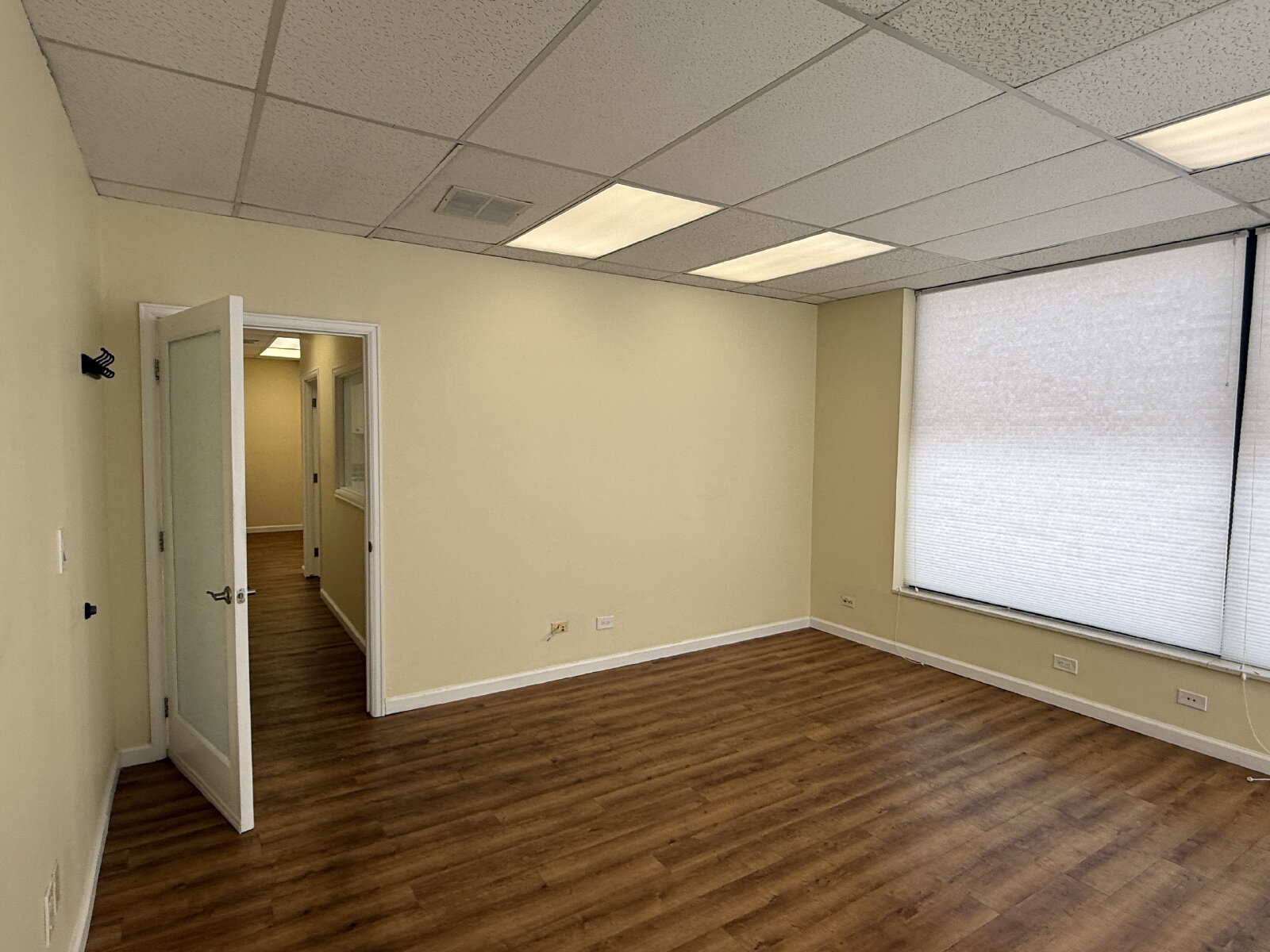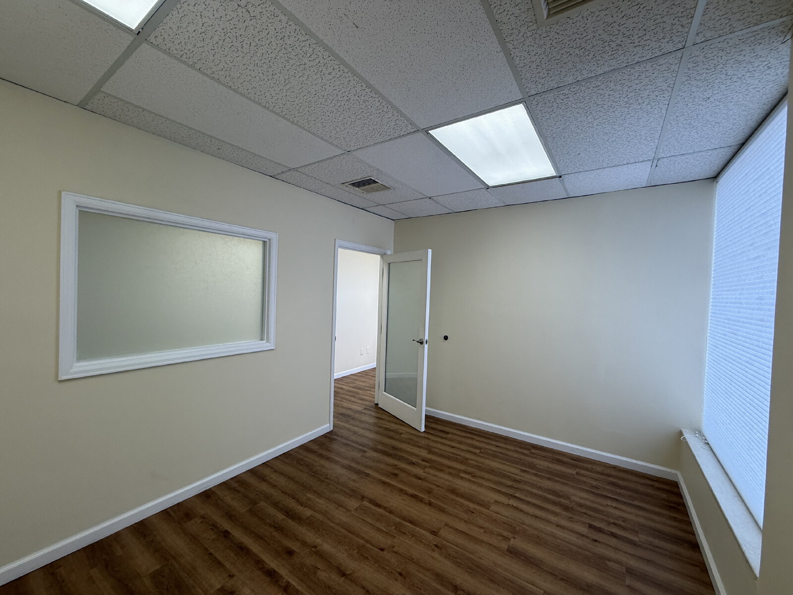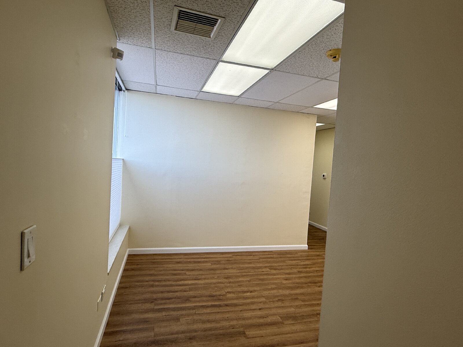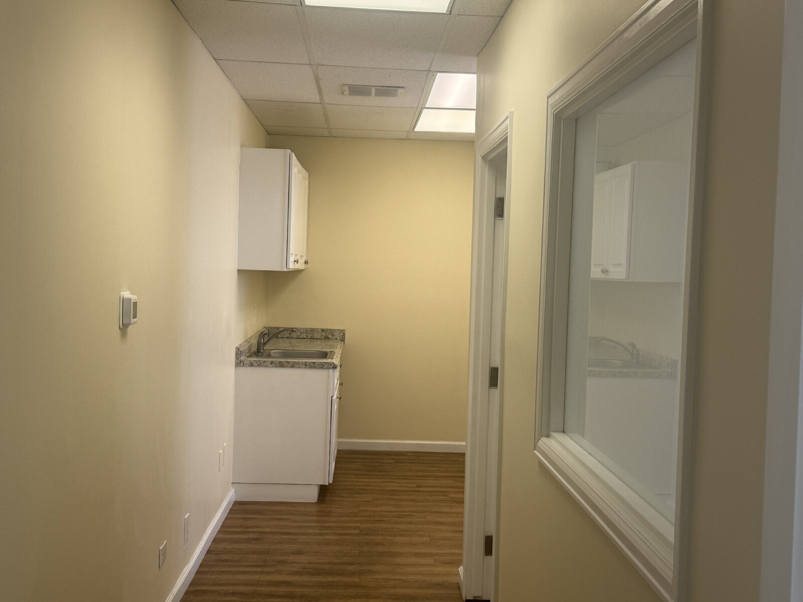 Impressive and efficient office suite featuring two private offices and a kitchenette with sink, and vinyl plank floors. The suite welcomes you with a cozy entry area—ideal for a client waiting space. A smart layout separates the kitchenette from the work areas, leading to two light-filled private offices. One office boasts a wall of windows, while the corner office features windows on two sides, flooding the space with natural light throughout the day. A polished, professional setting perfect for businesses looking to make a great first impression.