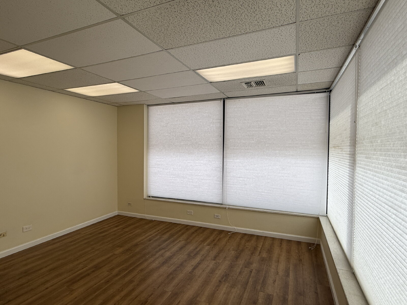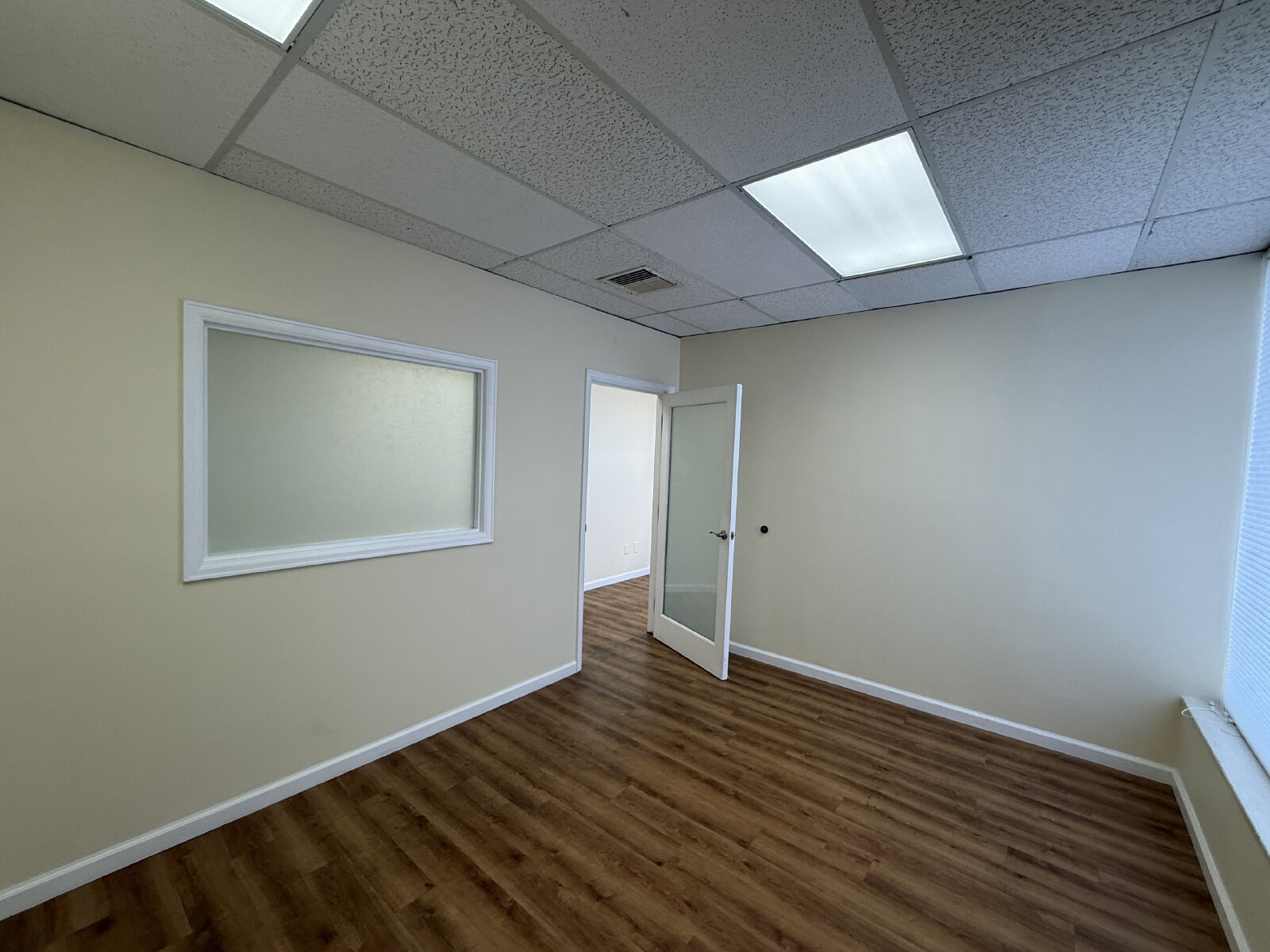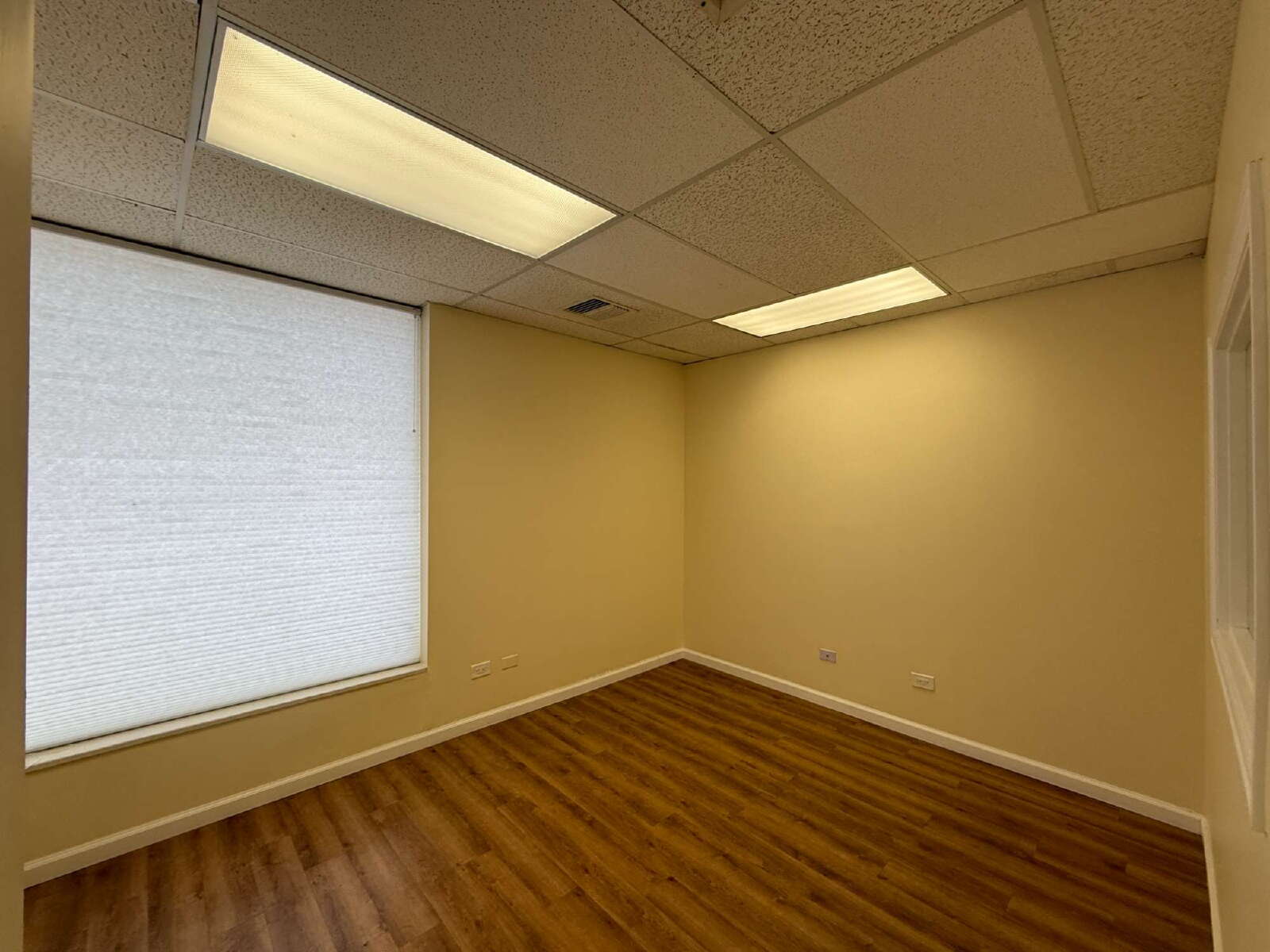 Impressive and efficient office suite featuring two private offices and a kitchenette with sink, and vinyl plank floors. The suite welcomes you with a cozy entry area—ideal for a client waiting space. A smart layout separates the kitchenette from the work areas, leading to two light-filled private offices. One office boasts a wall of windows, while the corner office features windows on two sides, flooding the space with natural light throughout the day. A polished, professional setting perfect for businesses looking to make a great first impression.