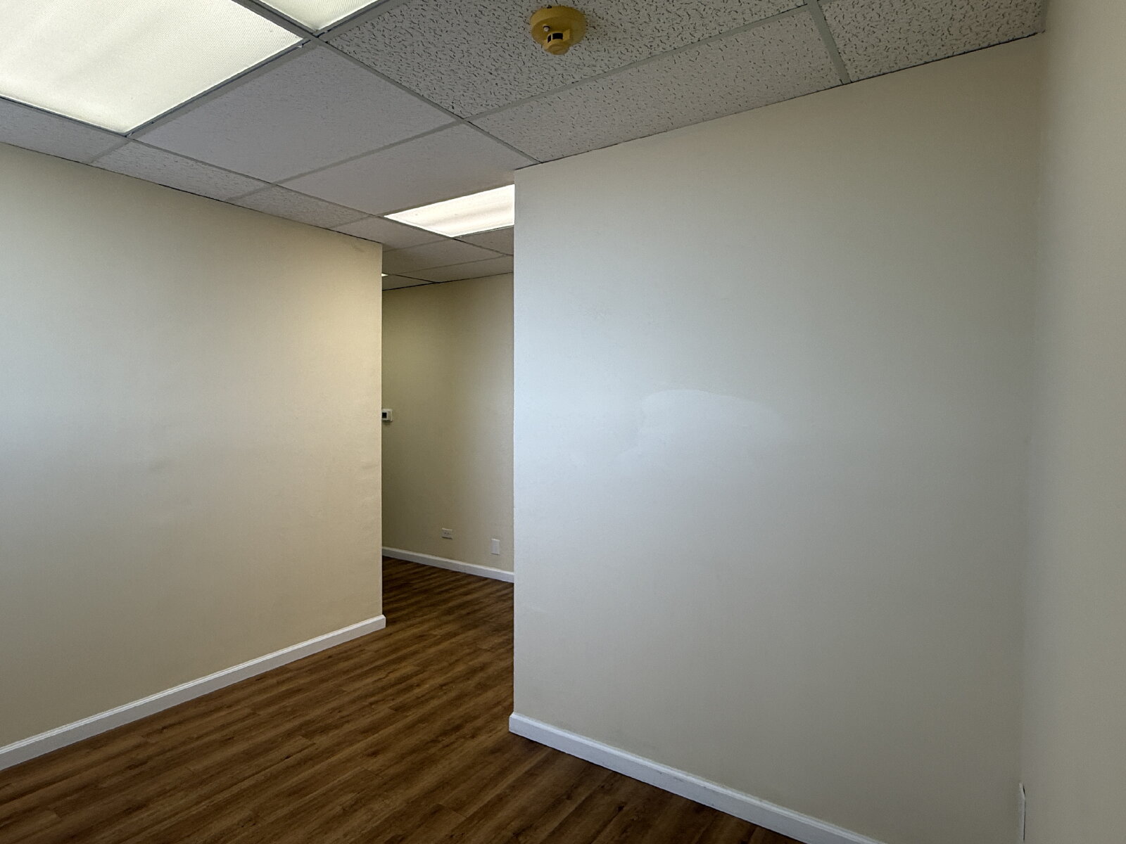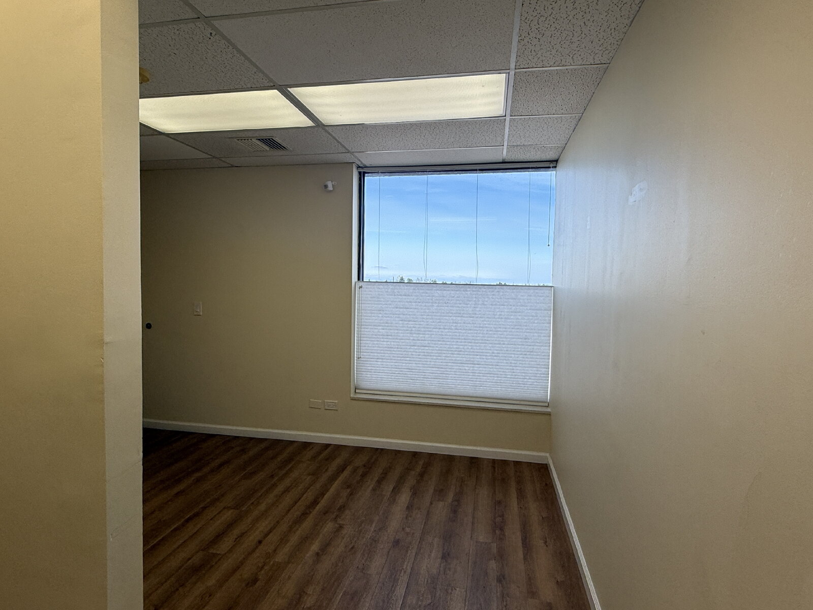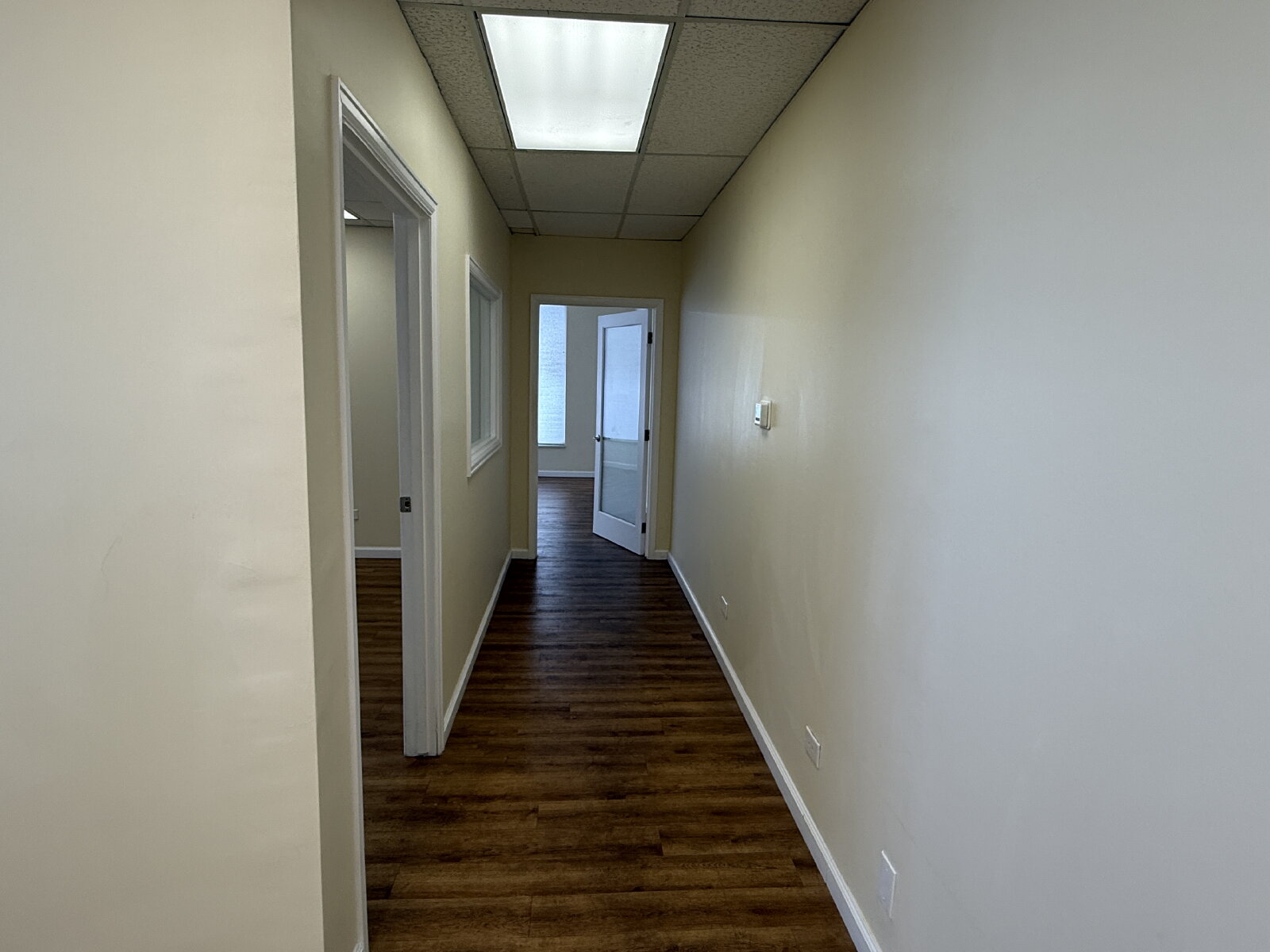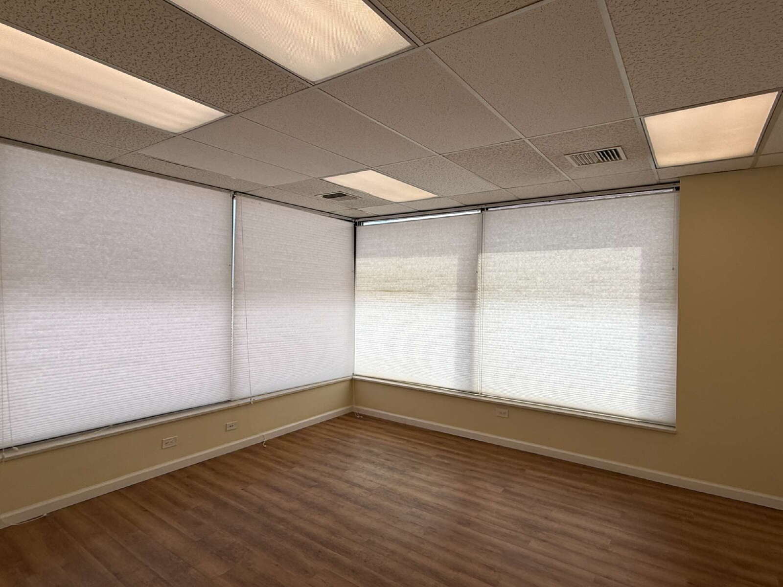Impressive and efficient office suite featuring two private offices and a kitchenette with sink, and vinyl plank floors. The suite welcomes you with a cozy entry area—ideal for a client waiting space. A smart layout separates the kitchenette from the work areas, leading to two light-filled private offices. One office boasts a wall of windows, while the corner office features windows on two sides, flooding the space with natural light throughout the day. A polished, professional setting perfect for businesses looking to make a great first impression.