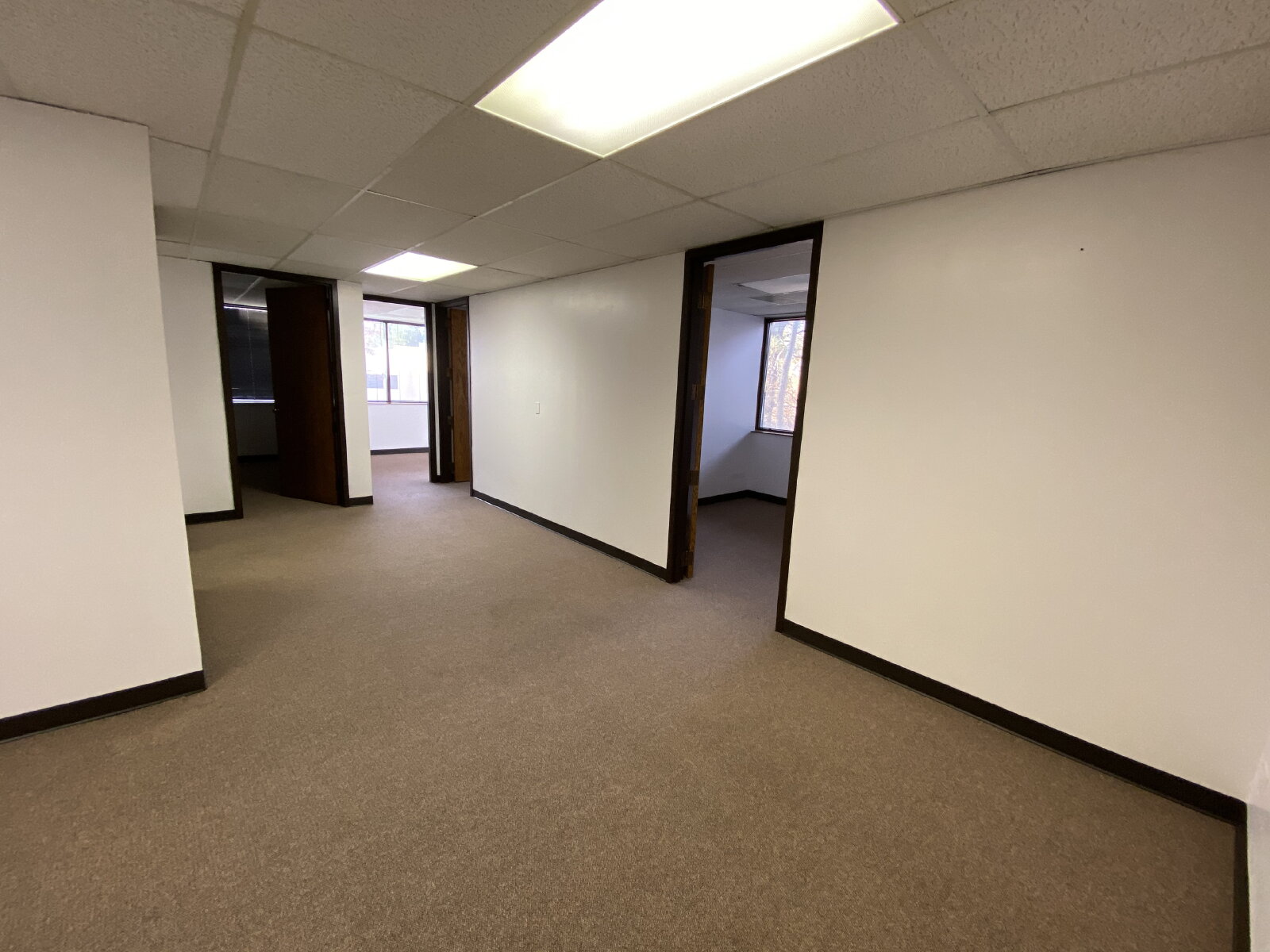Located on the first/lower level, this suite offers convenient access to the stairwell for easy entry. Several of the offices, including the two back offices and the right-side office, feature windows along the back wall, allowing for great natural light throughout the space.