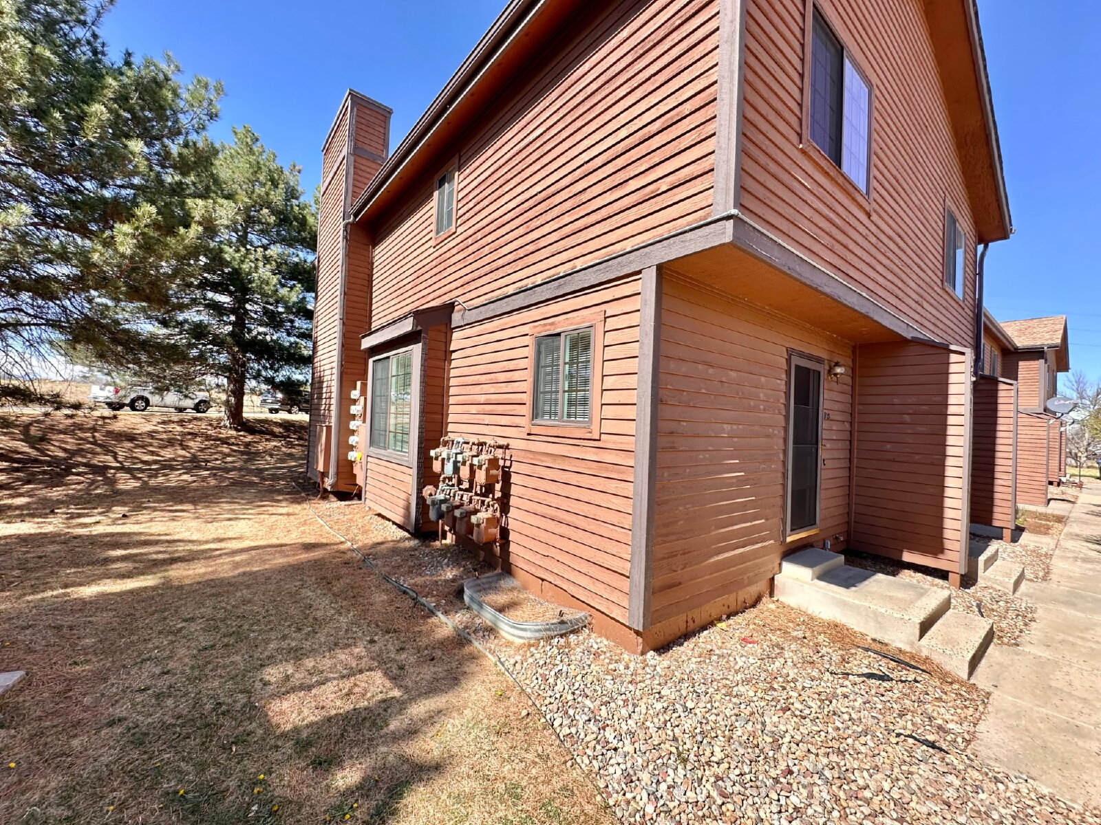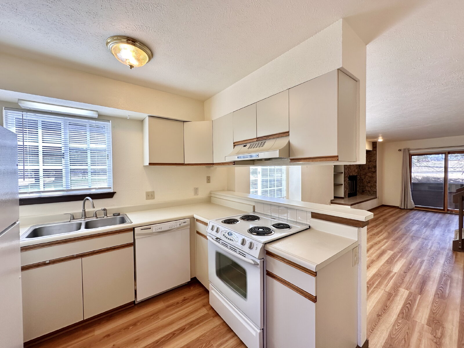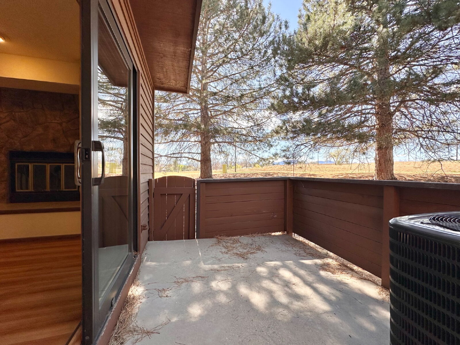 The home features a bright and open layout, highlighted by south-facing windows that fill the living room and kitchen with natural light. The main level includes a spacious combined living and dining area, a cozy wood-burning fireplace, and a convenient half bath just off the kitchen. Step outside to a private porch with a gate that provides direct access to the community’s shared yard.