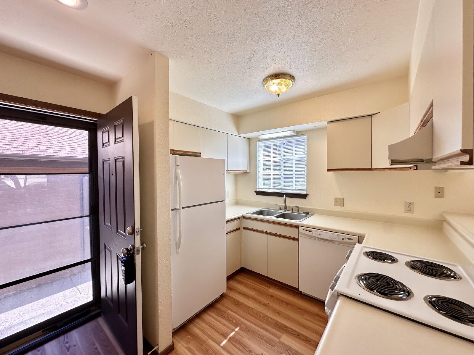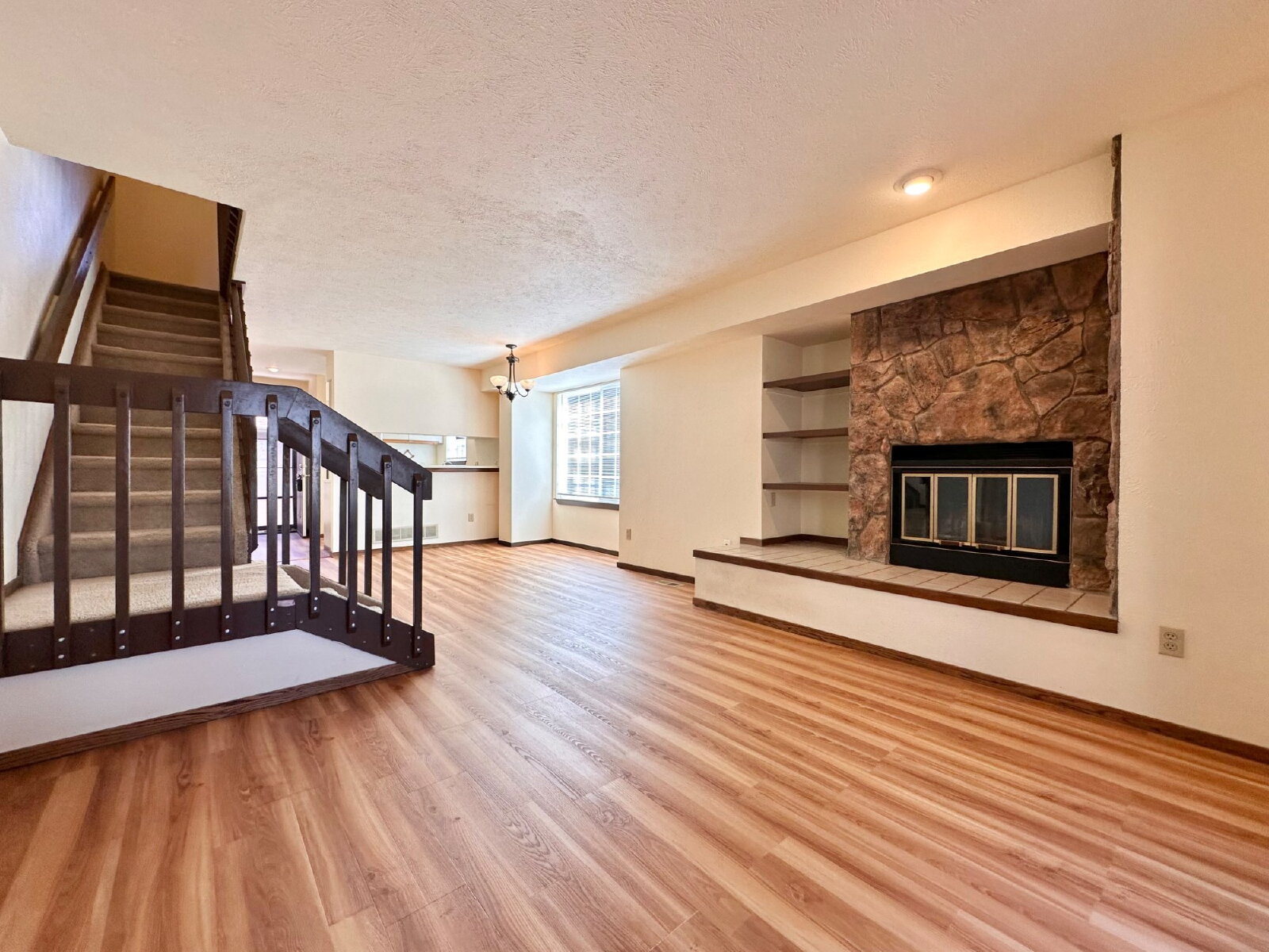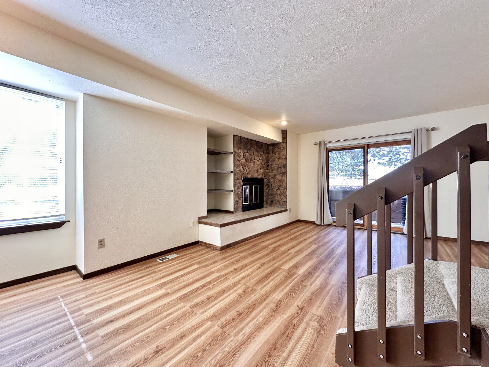 The home features a bright and open layout, highlighted by south-facing windows that fill the living room and kitchen with natural light. The main level includes a spacious combined living and dining area, a cozy wood-burning fireplace, and a convenient half bath just off the kitchen. Step outside to a private porch with a gate that provides direct access to the community’s shared yard.